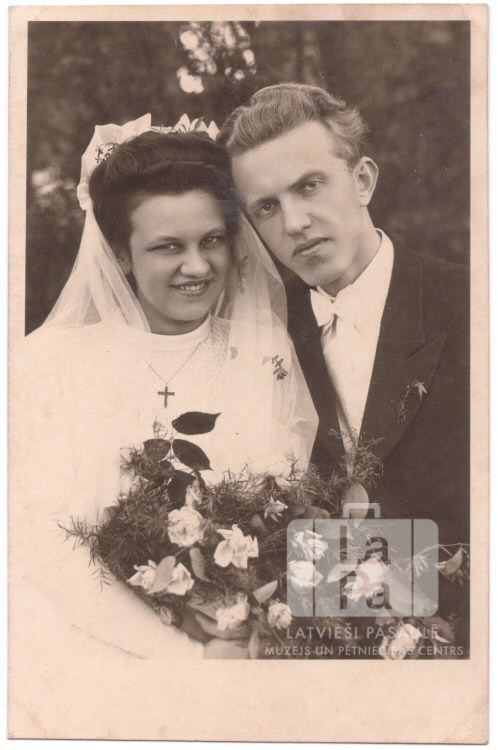 Gertneru pāra kāzu portrets Bevernē (angļu zonā). Līgava kāzu kleitā un ziedu pušķi rokā ar līgavaini uzvalkā. No kreisās: pirmā Sarma Gertners (dz. Veidis) un otrais Valdis Gertners.