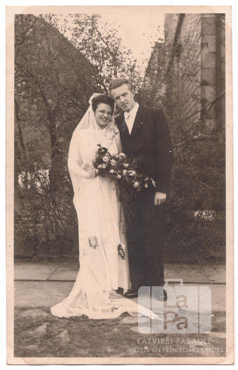 Gertneru pāra kāzu portrets Bevernē (angļu zonā). Līgava kāzu kleitā un ar ziedu pušķi rokā un līgavainis uzvalkā stāv uz ietves krūma priekšā. Fonā aiz krūma ir vairākstāvu ēkas. No kreisās: pirmā Sarma Gertners (dz. Veidis) un otrais Valdis Gertners.