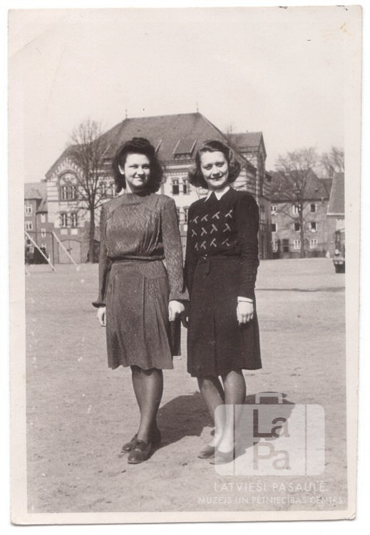 Divas jaunietes stāv laukumā Lībekā (angļu zonā) ap 1947. gadu. Otrpus laukumam ir vairākstāvu mūra ēkas, pie kurām aug koki bez lapām. No kreisās: Sarma Veidis (pr. Gertners) un Vera Michaļčuka.