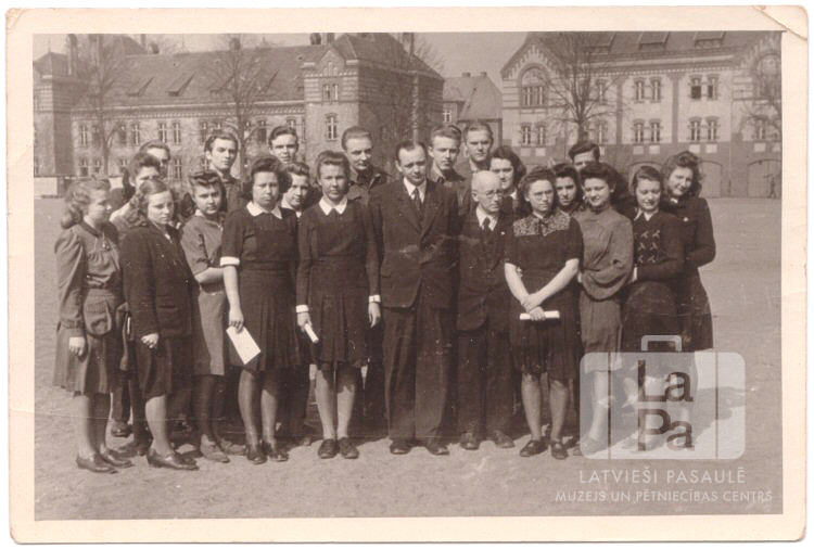 Otrais izlaidums Lībekas ģimnāzijā (angļu zonā). Klases portrets vairākās rindās laukumā. Pirmās rindas vidū stāv divi vīrieši uzvalkos. Fonā ir trīsstāvu mūra ēkas ar bezlapu kokiem priekšā. Pirmajā rindā, no kreisās: sestais ? Bulkāns (direktors), septītais ? Liepiņš (inspektors), devītā Sarma Veidis (pr. Gertners). Pēdējā rindā, piektais no kreisās: Valdis Gertners.