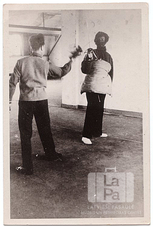 Divi latviešu studentu korporācijas "Gersicania" biedri paukojas Pinnebergā (angļu zonā). Viens stāv ar muguru pret fotogrāfu, otram galvā ir aizsargs un uz vēdera uzsiets spilvens. Fonā kreisajā pusē ir redzama telpas tālākā daļa, ap stūri.