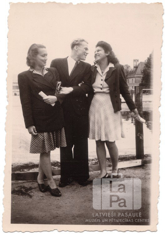 Trīs ģimnāzijas audzēkņi no Lībekas (angļu zonā) ap 1947. gadu stāv pie ūdenstilpes. Divas jaunietes kleitās un jakās; viņām pa vidu stāv jauneklis uzvalkā. Fonā ir upe vai ezers; otrā krastā ir redzama mūra ēka. No kreisās: Vera Michaļčuka, Gunārs Stumbrs, Sarma Veidis (pr. Gertners).