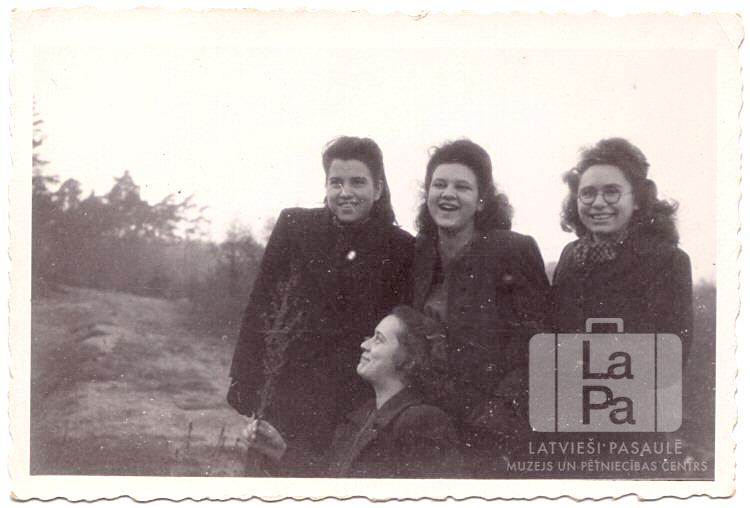 Četras jaunietes no Lībekas ģimnāzijas (angļu zonā) ap 1947. gadu pastaigas laikā. Viena jauniete sēž priekšā profilā, aizmugurē stāv trīs jaunietes; visas ir ģērbušās mēteļos. Fonā ir neliela nogāze ar lauku un mežu. Aizmugurē, otrā no kreisās: Sarma Veidis (pr. Gertners).