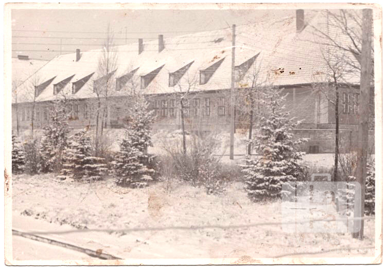 Gara vienstāvu ēka ar augstu, slīpu jumtu Pinnebergas nometnē (angļu zonā) ap 1948. gadu. Priekšplānā ir egļu rinda. Visu ainavu klāj sniegs.