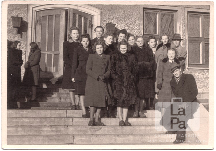 Zobārstniecības studenti Baltijas Universitātē Pinnebergā (angļu zonā) ap 1948. gadu. Cilvēku grupa mēteļos stāv uz mūra ēkas kāpnēm. Viens vīrietis labajā pusē sēž uz kāpņu apmales. Aizmugurē ir pavērtas ēkas ieejas durvis un divi logi.