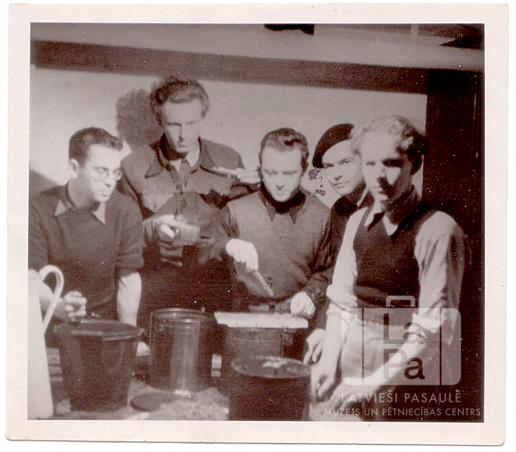 Pieci Baltijas Universitātes studenti ap galdu Pinnebergā (angļu zonā) ap 1948. gadu. Uz galda ir spainis un lielas metāla bundžas; uz vienas no tām ir mazs dēlis. Vienam jauneklim rokās ir krūze ar dzērienu, citam – nazis (?). Otrais no kreisās: Valdis Gertners.