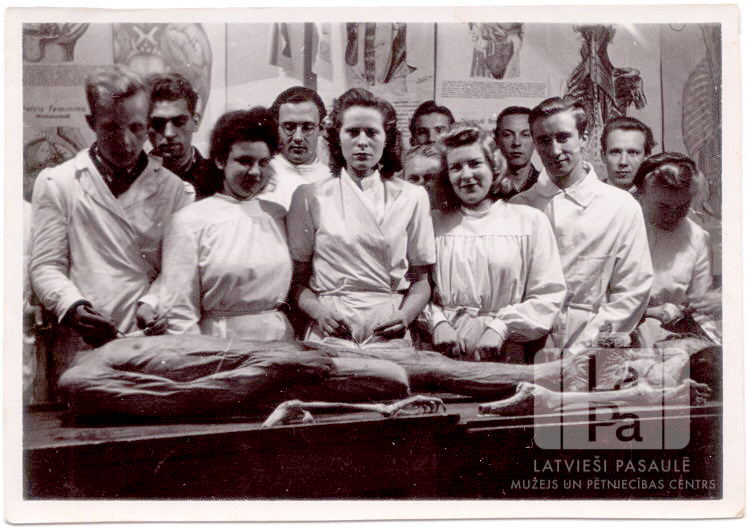 Pirmā kursa medicīnas un zobārstniecības studenti pie līķu sekcijas anatomikumā Baltijas Universitātē Pinnebergā (angļu zonā) ap 1948. gadu. Jauniešu grupa gaišos halātos stāv vairākās rindās. Priekšplānā uz galda ir sažuvis vīrieša līķis bez galvas un labās kājas. Līķim blakus ir kreisās rokas un labās kājas skeleti. Fonā uz sienas ir cilvēka ķermeņa daļu zīmējumi. Pirmajā rindā, otrā no kreisās: Sarma Veidis (pr. Gertners).