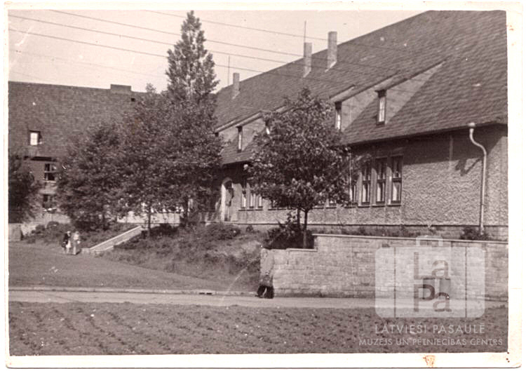 Divstāvu mūra ēka Pinnebergā (angļu zonā) ap 1948 gadu. Ēkā atradās Baltijas Universitātes lekciju telpas. Ēkas priekšā uz nelielas nogāzes aug atsevišķi koki. Nogāzes lejasdaļā, laukumā, pastaigājas divi cilvēki. Priekšplānā ir bruģēta iela.