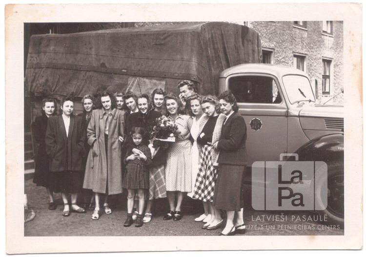 Cilvēku grupa pie smagās automašīnas Pinnebergā (angļu zonā) ap 1948. gadu, atvadoties no aizceļojošas Baltijas Universitātes studentes. Grupas vidū ir redzama smaidīga, jauna sieviete gaišā kleitā un ziediem rokās. Priekšā stāv maza meitene. Smagās automašīnas kravas nodalījums ir apvilkts ar brezentu. Fonā ir vairākstāvu mūra ēka. Aizmugurē, pirmais no labās: Valdis Gertners.