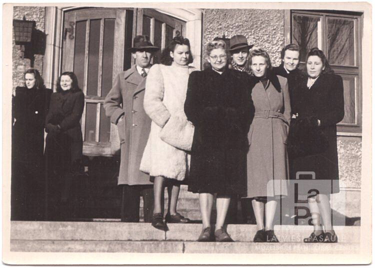 Maza Baltijas Universitātes zobārstniecības studentu grupa stāv uz mūra ēkas kāpnēm Pinnebergas nometnē (angļu zonā) ap 1948. gadu. Visi ir ģērbušies mēteļos. Kāpņu augšgalā ir viegli pavērtas durvis; uz sienām durvju kreisajā pusē ir lukturis, zem kura stāv divas jaunietes. Durvju labajā pusē ir logs. Pirmajā rindā, pirmā no kreisās: ? Raimonda (zobārste, lektore, Baltijas Universitātes zobārstniecības fakultātes vadītāja).