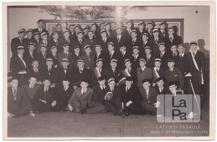 Studentu korporāciju korporanti 5 rindās tautu komeršā Pinnebergā (angļu zonā) ap 1948. gadu. Liela vīriešu grupa vairākās rindās. Vīrieši uzvalkos, ar cepurēm galvās; vairākiem vīriešiem šķērsām pāri uzvalkiem ir lentes. Divi vīrieši rokās tur paukošanās ieročus. Priekšplānā pie griestiem karājas liela, sazarota lampa. Fonā pie sienas, iespējams, ir liela glezna.
