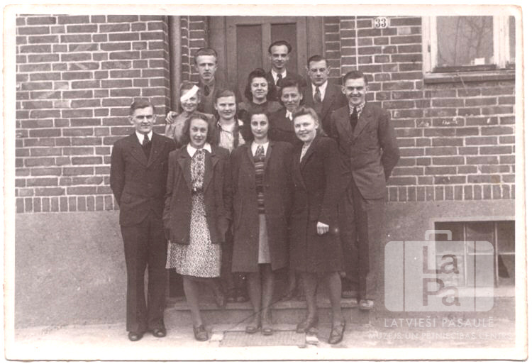 Cilvēku grupa četrās rindās stāv pie ķieģeļu ēkas ieejas durvīm Valderzē nometnē Lībekā (angļu zonā) ap 1946. gadu. Labajā pusē ir redzams viens ēkas pagrabstāva un viens ēkas pirmā stāva logs. Pēdējā rindā, pirmais no kreisās: Valdis Gertners.