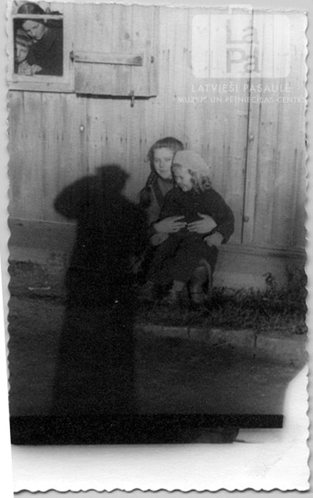 Divas mazas meitenes sēž pie koka barakas Celles nometnē (angļu zonā) ap 1945. gadu. Mazākā meitene sēž lielākajai meitenei klēpī. Viņām kreisajā pusē ir redzama fotogrāfa ēna. Fonā logā kreisajā pusē ir redzami divi cilvēki. Priekšā, no kreisās: Brigita Plūme un Selga Stārķis (pr. Pešudovs).