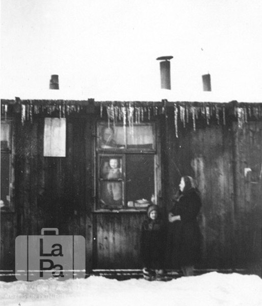 Cilvēki ziemas laikā pie vienstāvu koka barakas loga Zēdorfas nometnē (angļu zonā). Mazs bērns un sieviete stāv loga ārpusē; mazs bērns un vīrietis stāv pie loga iekšpusē. Zeme un jumts ir apsniguši, no jumta karājas lāstekas. Priekšā, no kreisās: Selga Stārķis (bērnībā; pr. Pešudovs) un Emīlija Lasmanis. Aiz loga, no apakšas: Udo Stārķis (bērnībā) un Edgars Stārķis. Foto autors: Ilona Stārķis.