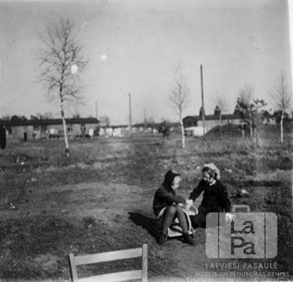 Divas mazas meitenes rotaļājas Zēdorfas nometnē (angļu zonā). Priekšplānā ir redzama koka krēsla atzeltne. Fonā uz lauka izklaidus aug vairāki koki; tālumā ir vienstāvu koka barakas. No kreisās: Selga Stārķis (pr. Pešudovs) un Maija Steps.