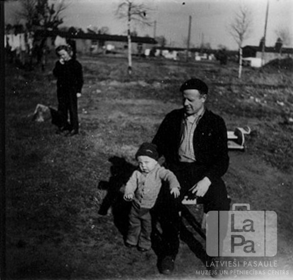 Edgars Stārķis ar bērniem Zēdorfas nometnē (angļu zonā). Priekšā sēž vīrietis ar mazu bērnu blakus. Aizmugurē kreisajā pusē stāv maza meitene. Fonā uz lauka izklaidus aug vairāki koki; tālumā ir vienstāvu koka barakas. Priekšā, no kreisās: Udo Stārķis un Edgars Stārķis. Aizmugurē stāv: Selga Stārķis (pr. Pešudovs).