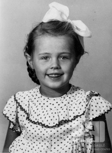 Selgas Stārķis (pr. Pešudovs) bērnības portrets (angļu zonā) pases fotogrāfijai un izbraukšanai uz Austrāliju. Maza, smaidīga meitene gaišā, tumši punktotā kleitā un gaišu lenti matos.