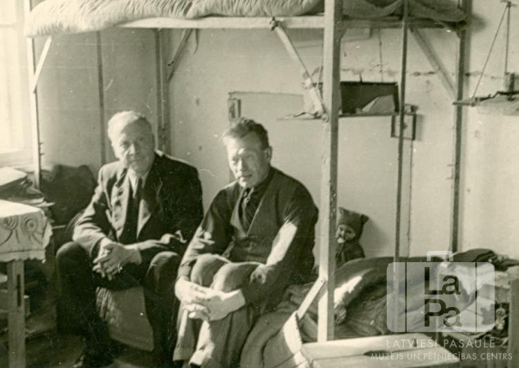 Divi vīrieši sēž uz divstāvu gultas apakšējās lāvas Hohfeldes nometnē Augsburgā (amerikāņu zonā). Redzams istabas iekārtojums – galda stūris pie loga kreisajā pusē, radio aparāts (?) plauktā zem otrā stāva lāvas. Aiz viena no vīriešiem pret sienu ir atspiesta lelle. Priekšplānā labajā pusē ir koka mēbeles – ķeblis un plaukts. No kreisās: Otto Krolls un Âdolfs Kaktiņš. Par šo gadījumu Sigurds Krolls stāsta: "Mans tēvs un Latvijas operas dziedātājs atsēdušies uz gultas mūsu istabā Hochfeldas DP nometnē. Ne visām ģimenēm nometnē bija atsevišķas istabas."