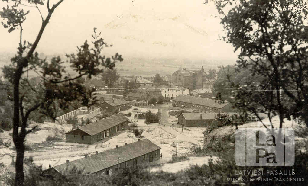 Skats no augšas uz garām vienstāvu barakām Bernsenes nometnē (angļu zonā). Priekšplānā ir redzams kalna nogāzes apaugums. Aiz nometnes ir vairākstāvu mūra ēkas un lauki.