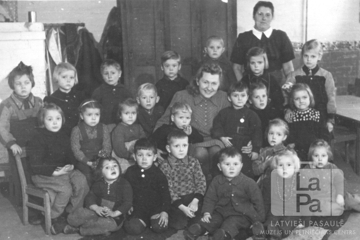 Bērnudārza audzēkņi ar klases audzinātāju Bernsenes nometnē (angļu zonā) 1945. gada rudenī. Bērni trīs rindās – pirmā rinda sēž uz grīdas, otrā, ar audzinātāju vidū, uz krēsliem, bet trešā stāv kājās. Aizmugurē stāv sieviete blakus skapim. Skapja kreisajā pusē pie sienas ir pakārti mēteļi. Pēdējā rindā, otrā no kreisā: Astrīda Pankare.