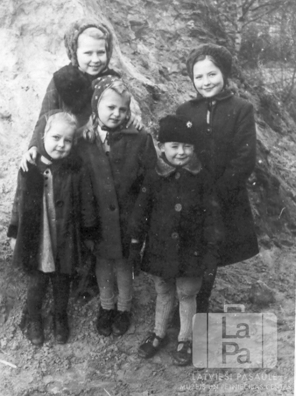 Bērni un jaunietes no Bernsenes nometnes (angļu zonā) 1945. gada rudenī. Priekšā stāv trīs mazi bērni, aizmugurē stāv divas jaunietes. Visiem mugurā ir mēteļi un cepures vai lakati. Fonā ir stāva nogāze, uz kuras aug koks un krūmi. Priekšā, no kreisās: pirmā Astrīda Pankare un trešais Ādolfs ?. Aizmugurē, no kreisās: Silva Pankare un Lidija ?.