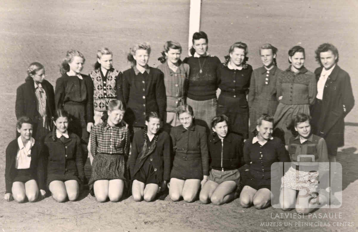 Meiteņu vingrošanas klases skolotāja ar skolniecēm Špakenbergas nometnē pie Gēsthahtas (angļu zonā). Astoņpadsmit jaunietes divās rindās sporta laukumā; pirmā rinda tup uz ceļiem. Aizmugurē ir gaišs stabs. Pirmās rindas vidū ir redzama Brigita Ūdre. Aizmugurē, otrā no kreisās puses: Silva Pankare (pr. Zariņa).