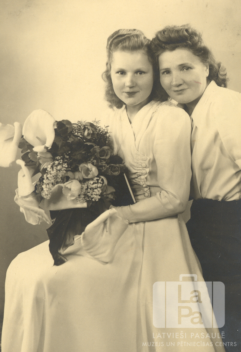 Elga Kalēja ar māti savās iesvētībās Špakenbergā pie Gēsthahtas (angļu zonā). Jauniete gaišā, greznā kleitā sēž ar puķu pušķi rokās; viņai blakus stāv sieviete tumšos svārkos un gaišā blūzē. No kreisās: Elga Kalēja un Alīda Kalēja.