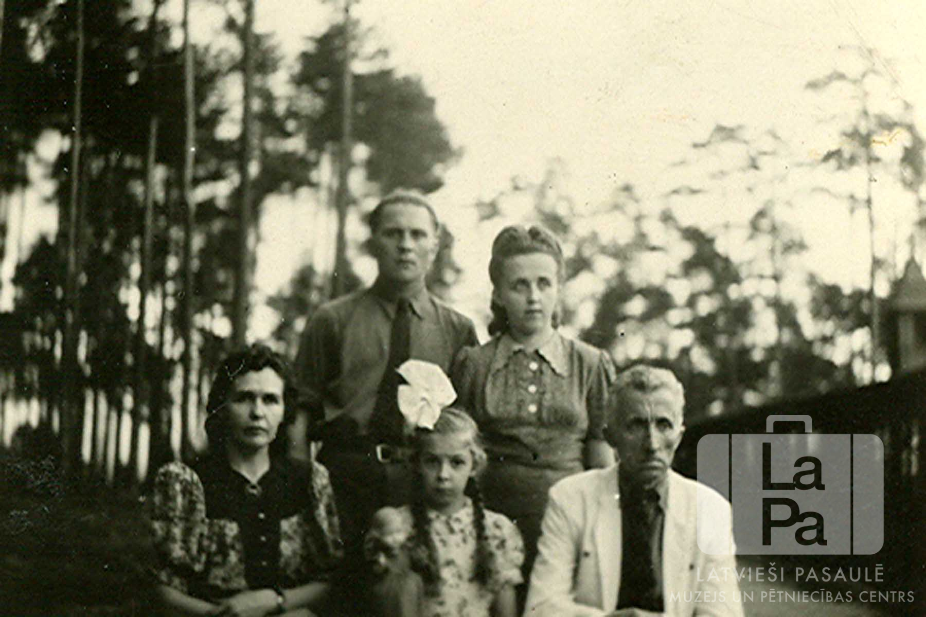 Bērziņu un Drēviņu ģimenes Veidenes nometnē (amerikāņu zonā). Priekšā trīs cilvēki sēž, aizmugurē stāv jauns pāris. Fonā ir mežs un vienstāvu baraka. Priekšā, no kreisās: Erna Bērziņa, Silvija Bērziņa (pr. Martin) un Hermanis Bērziņš. Aizmugurē stāv, no kreisās: Alfrēds Drēviņš un Ira Drēviņa (dz. Bērziņa).