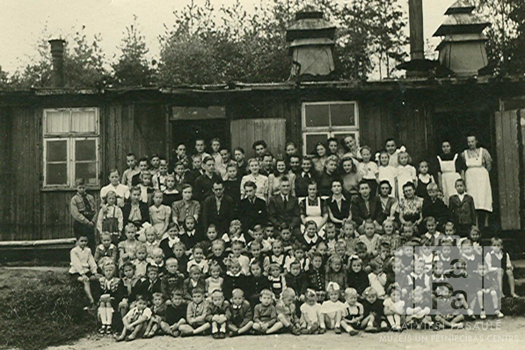 Latviešu pamatskolas skolēni un skolotāji pie skolas vienstāvu koka barakas Veidenes nometnē (amerikāņu zonā). Liela bērnu un skolotāju grupa, redzamas arī vairākas sievietes gaišos priekšautos. Fonā ir redzamas noplukušas barakas divas ieejas durvis un divi logi. Ceturtajā rindā, trīspadsmitā no kreisās: Silvija Bērziņa (pr. Martin).