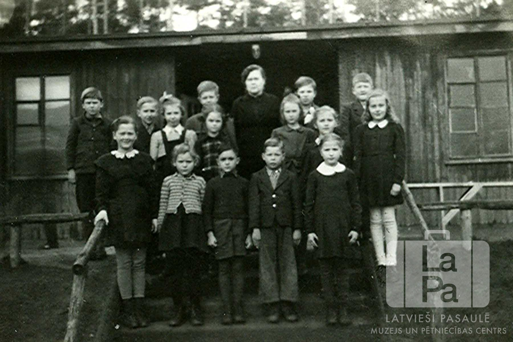 Pamatskolas 3. klases skolēni ar klases audzinātāju pie skolas vienstāvu koka barakas Veidenes nometnē (amerikāņu zonā). Bērni trīs rindās stāv uz kāpnēm barakas priekšā; skolotāja stāv trešās rindas vidū. Aizmugurē ir redzama barakas ieeja un divi logi; fonā aiz barakas ir mežs. Pirmajā rindā, otrā no kreisās: Milda Melderis. Otrajā rindā, no kreisās: otrā Silvija Bērziņa (pr. Martin), piektā Ināra Gulbis un sestā Silvija Grauziņa.