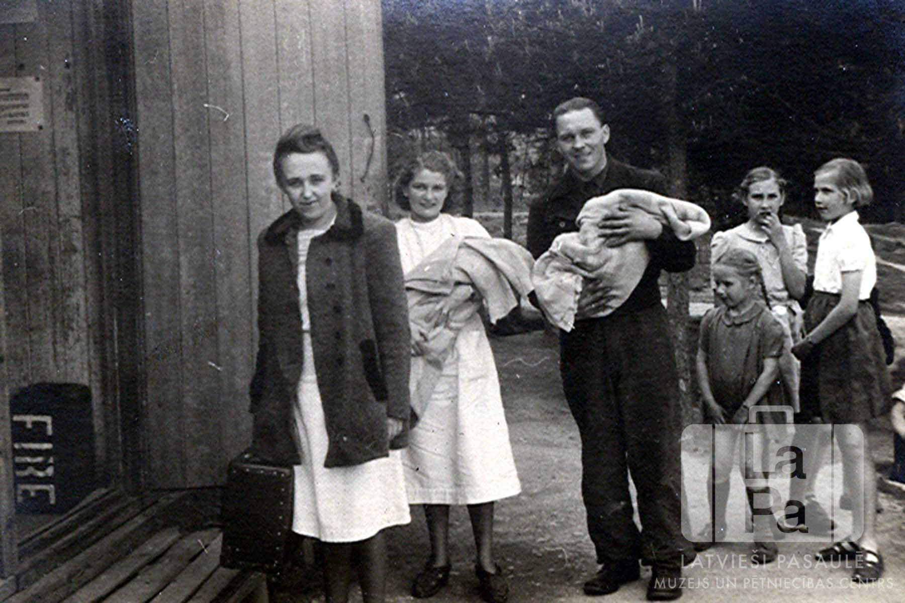 Ira Drēviņa stāv pie Bērziņu un Drēviņu ģimeņu koka barakas Veidenes nometnē (amerikāņu zonā), pārrodoties mājās no slimnīcas ar jaunpiedzimušiem dvīņiem. Priekšā kreisajā pusē sieviete ar koferi rokā stāv pie koka barakas atvērtām durvīm. Uz barakas grīdas ir redzams sainis/ kaste ar uzrakstu "FIRE". Aiz viņas medicīnas māsa gaišā halātā un jauns vīrietis nes divus zīdaiņus, satītus segās. Aizmugurē stāv trīs dažāda vecuma meitenes. Fonā ir mežs. No kreisās: pirmā Ira Drēviņa (dz. Bērziņa), trešais Artūrs Drēviņš (zīdainis segā), ceturtais Alfrēds Drēviņš un piektā Anita Drēviņa (zīdainis segā).