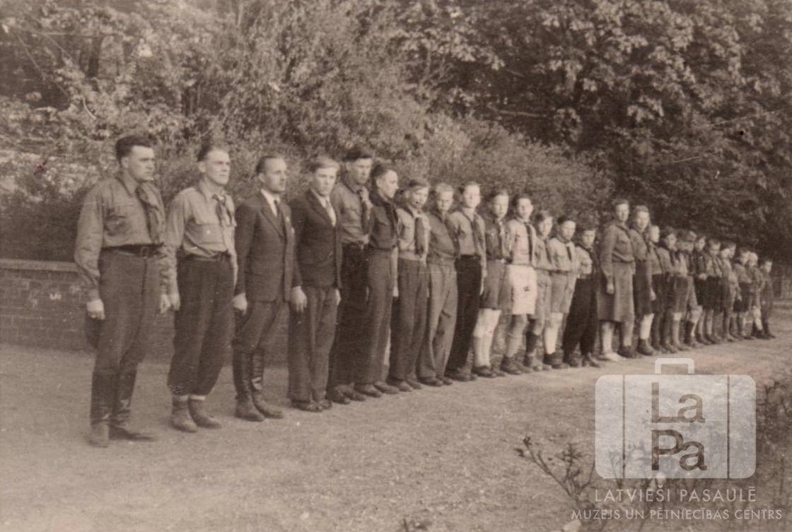 Skauti un gaidas no Giftenes nometnes (angļu zonā) formastērpos stāv uz takas ierindā, sadalīti pa dzimumiem. Fonā ir zems mūris, virs kura aug krūmāji un mežs.