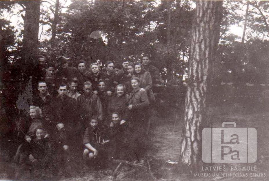 Ļaudis mežā 6. skautu un gaidu vadītāju sagatavošanas kursos, kas no 1946. gada 8. līdz 16. jūnijam notika Elbas krastā. Kursos piedalījās arī cilvēki no Gēsthahtas (angļu zonā). Cilvēki vairākās rindās; pirmā rinda sēž uz zemes. Priekšplānā labajā pusē aug priede.
