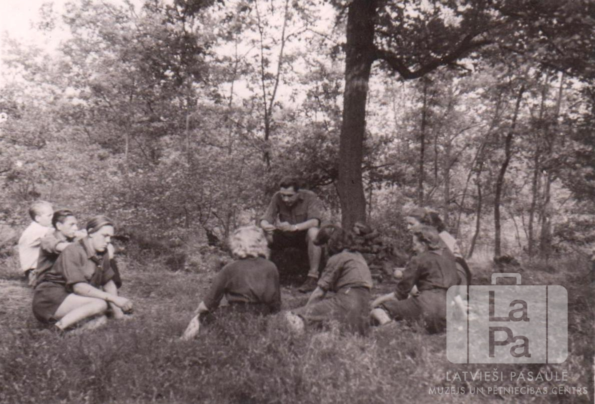 Jaunieši mežā sēž pusaplī un klausās vīrieša lekciju 6. skautu un gaidu vadītāju sagatavošanas kursos, kas no 1946. gada 8. līdz 16. jūnijam notika Elbas krastā. Kursos piedalījās arī cilvēki no Gēsthahtas (angļu zonā).