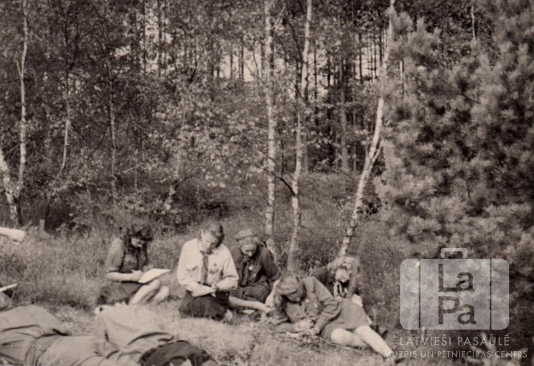 Jaunieši meža malā 6. skautu un gaidu vadītāju sagatavošanas kursos, kas no 1946. gada 8. līdz 16. jūnijam notika Elbas krastā. Kursos piedalījās arī cilvēki no Gēsthahtas (angļu zonā). Priekšplānā uz vēdera guļ divi skauti formastērpos, ar mugurām pret fotogrāfu. Aiz viņiem gaidas formastērpos veic pierakstu.