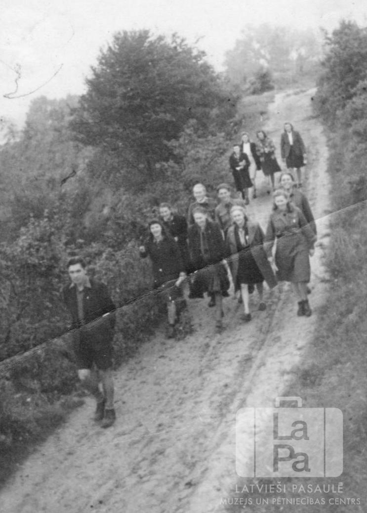Jaunieši dodas pa šauru zemes ceļu 6. skautu un gaidu vadītāju sagatavošanas kursos, kas no 1946. gada 8. līdz 16. jūnijam notika Elbas krastā. Kursos piedalījās arī cilvēki no Gēsthahtas (angļu zonā). Abpus ceļam ir mežs. Skats no augšas.