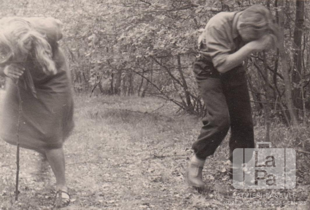 Divi jaunieši rotaļu laikā 6. skautu un gaidu vadītāju sagatavošanas kursos, kas no 1946. gada 8. līdz 16. jūnijam notika Elbas krastā. Kursos piedalījās arī cilvēki no Gēsthahtas (angļu zonā). Jauniete un jauneklis saliekušies stāv, atbalstījuši galvas pret nūjām. Fonā ir mežs.