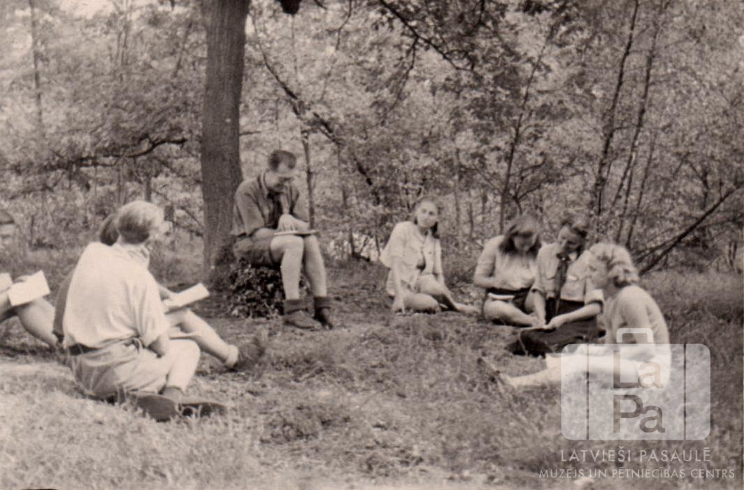 Jaunieši meža malā sēž pusaplī un klausās vīrieša lekciju 6. skautu un gaidu vadītāju sagatavošanas kursos, kas no 1946. gada 8. līdz 16. jūnijam notika Elbas krastā. Kursos piedalījās arī cilvēki no Gēsthahtas (angļu zonā). Jaunieši ir ģērbušies formastērpos, vairākiem rokās ir grāmatas/ pieraksti.