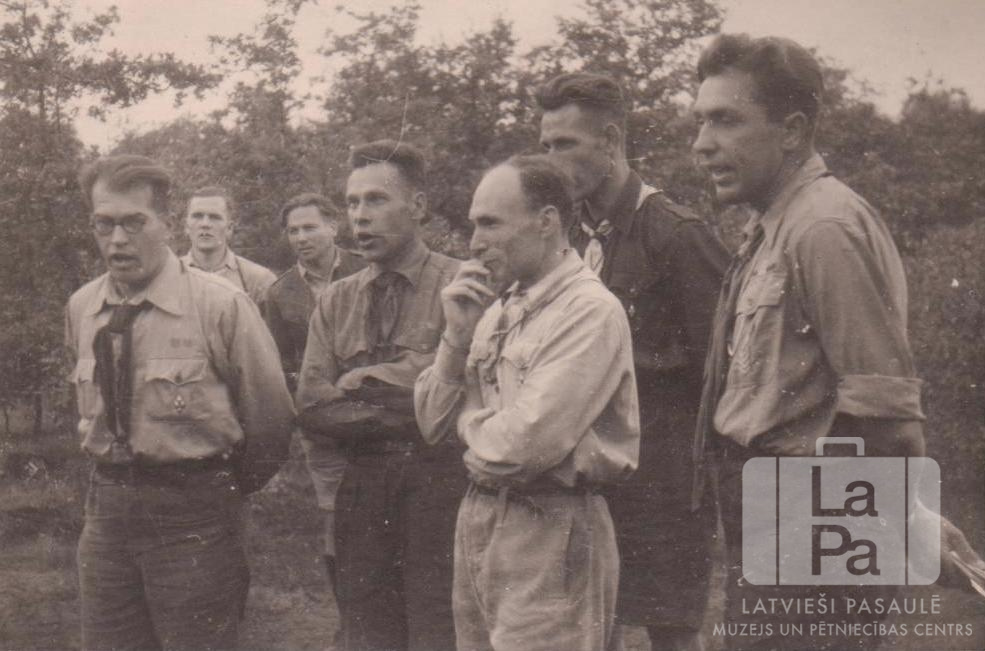 Septiņi vīri formastērpos dzied dziesmu "Pūt, vējiņi" 6. skautu un gaidu vadītāju sagatavošanas kursos, kas no 1946. gada 8. līdz 16. jūnijam notika Elbas krastā. Kursos piedalījās arī cilvēki no Gēsthahtas (angļu zonā). Fonā ir mežs. Starp vīriem ir redzami: Edgars Dunsdorfs (vadītājs) un A. Artmanis (vadītājs).