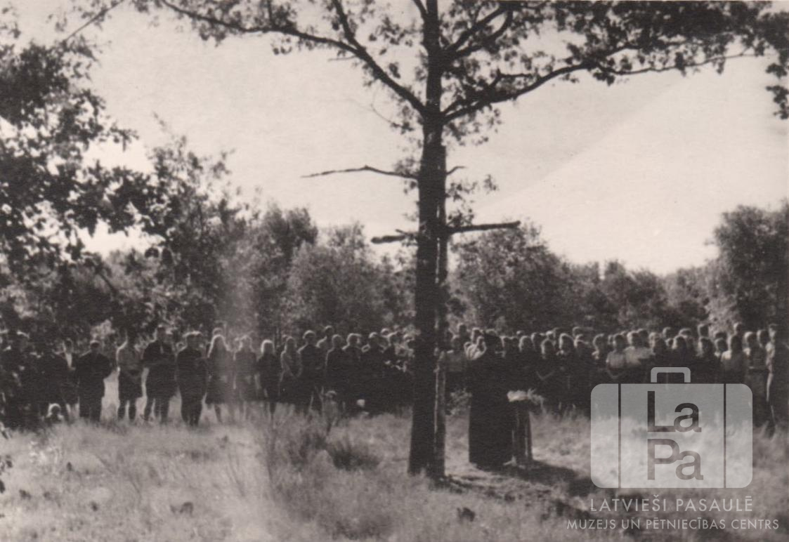 Skauti un gaidas formastērpos stāv pusaplī 6. skautu un gaidu vadītāju sagatavošanas kursos, kas no 1946. gada 8. līdz 16. jūnijam notika Elbas krastā. Kursos piedalījās arī cilvēki no Gēsthahtas (angļu zonā). Iespējams, tas ir brīvdabas dievkalpojums 1948. gada vasarā, kurā piedalās gaidas un Abavas 1. un skauti no Pērses 5. skautu vienībām Saules nometnē Gēsthahtā. Cilvēki stāv pļavā. Priekšplānā ir koks, pie kura stumbra otrajā pusē ir nostiprināts koka krusts. Pie krusta stāv cilvēks ar muguru pret fotogrāfu. Fonā ir mežs.