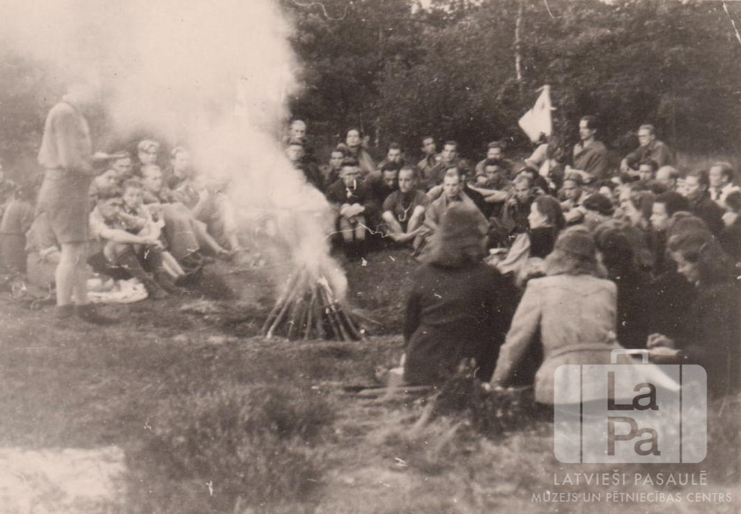 Skauti un gaidas sēž pusaplī ap dūmojošu ugunskuru 6. skautu un gaidu vadītāju sagatavošanas kursos, kas no 1946. gada 8. līdz 16. jūnijam notika Elbas krastā. Kursos piedalījās arī cilvēki no Gēsthahtas (angļu zonā). Pie ugunskura kreisajā pusē stāv vīrietis. Labajā pusē pusapļa vidū ir redzams gaišs karogs. Fonā ir mežs.