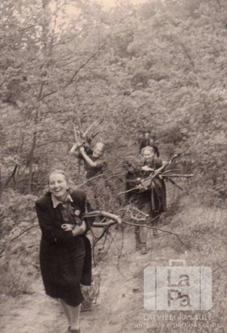Četras jaunietes cauri mežam nes zarus 6. skautu un gaidu vadītāju sagatavošanas kursos, kas no 1946. gada 8. līdz 16. jūnijam notika Elbas krastā. Kursos piedalījās arī cilvēki no Gēsthahtas (angļu zonā). Fonā aiz jaunietēm uz takas ir redzami divi jaunekļi.