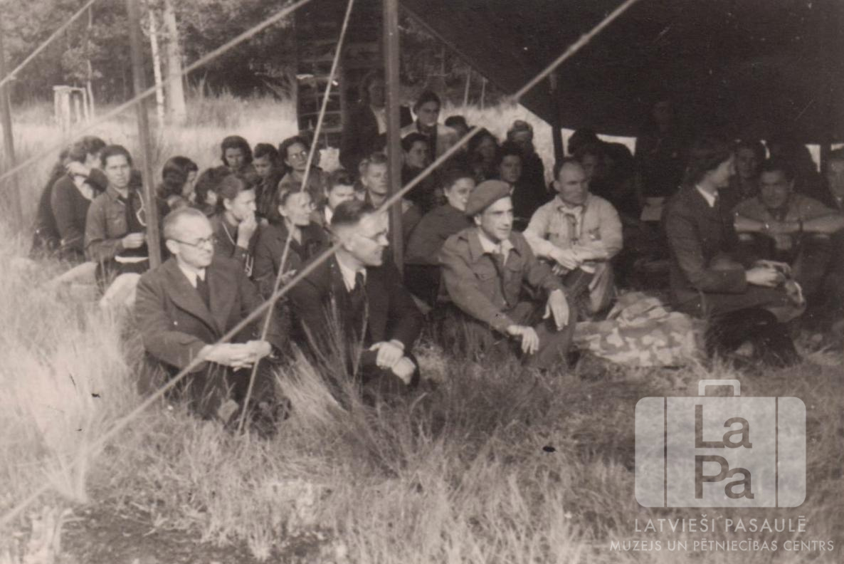 Ļaudis sēž zem audekla nojumes skautu vadītāju sagatavošanās kursos, kas no 1946. gada 8. līdz 16. jūnijam notika Elbas krastā. Kursos piedalījās arī cilvēki no Gēsthahtas (angļu zonā). Priekšplānā kreisajā pusē ir redzamas audekla atsaites. Nojumes galā ir šaurs skapis (?). Fonā ir mežs.