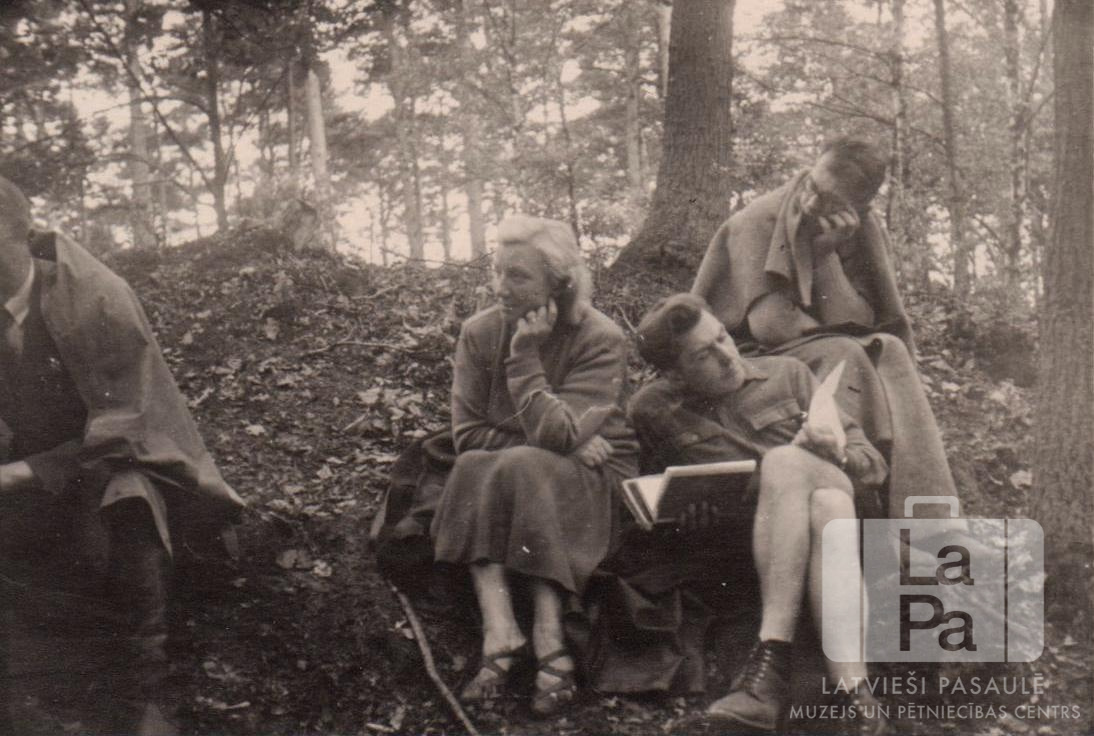Trīs vīrieši un sieviete sēž uz zemas meža nogāzes skautu vadītāju sagatavošanās kursos, kas no 1946. gada 8. līdz 16. jūnijam notika Elbas krastā. Kursos piedalījās arī cilvēki no Gēsthahtas (angļu zonā). Viens jauneklis ar grāmatām rokās lasa papīra lapu.