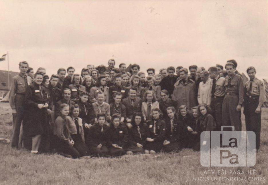 Liela cilvēku grupa skautu un gaidu vadītāju sagatavošanās kursos Pinnebergā (angļu zonā). Vīrieši un sievietes formastērpos vairākās rindās; pirmajā rindā jaunietes sēž uz zemes. Fonā kreisajā pusē masta galā plīvo Latvijas karogs. Aiz karoga ir redzama mūra ēka.