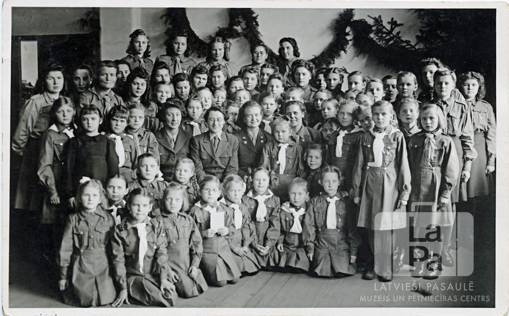 Skrundas 7. gaidu vienības gaidas un guntiņas guntiņu svinīgā solījuma reizē Hānavas nometnē (angļu zonā). Liela meiteņu un jauniešu grupa formastērpos vairākās rindās; vidū sēž vadītājas. Fonā kreisajā pusē ir durvis; telpa ir dekorēta ar egļu zaru vērtenēm. Pirmajā rindā, ceturtā no kreisās: Skaidrīte Krūmiņa (pr. McKeag; ar brillēm un papīra lapu rokās).