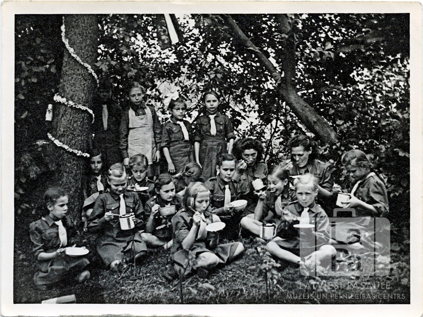 Skrundas 7. gaidu vienības guntiņas no Hānavas nometnes (angļu zonā) 1946. gada vasarā ēd pašu vārītu viru. Mazas meitenes kopā ar vadītājām mežā ēd no traukiem; visas ir ģērbušās formastērpos. Kreisajā pusē ap koku vijas ziedu lente. Aizmugurē stāv, trešā no kreisās: Skaidrīte Krūmiņa (pr. McKeag).