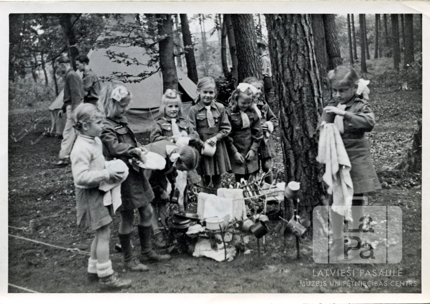 Skrundas 7. gaidu vienības guntiņas no Hānavas nometnes (angļu zonā) 1946. gada vasarā mežā mazgā savus pusdienu traukus un novieto tos uz pašu ierīkotas žāvētavas. Uz žāvētavas karājas krūzes, šķīvji, galda piederumi un dvieļi. Fonā gar telti dodas jaunekļi. Priekšā, ceturtā no kreisās: Inese Viķele. Pirmā no labās: Skaidrīte Krūmiņa (pr. McKeag).