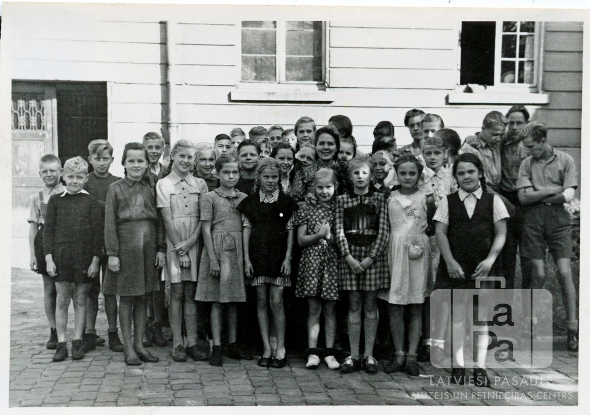 Latviešu pamatskolas skolēni ar skolotāju saulainā dienā stāv uz bruģētas ielas pie skolas ēkas Hānavas nometnē (angļu zonā) 1947.–1948. gadā. Otrās rindas vidū stāv skolotāja ar ziediem rokās. Redzamas ēkas durvis un divi logi. Pirmajā rindā, no kreisās: otrā Dzintra Vaivare, ceturtā Skaidrīte Krūmiņa (pr. McKeag) un septītā Inese Viķele. Otrajā rindā, trešais no kreisās: Ivars Viķelis.