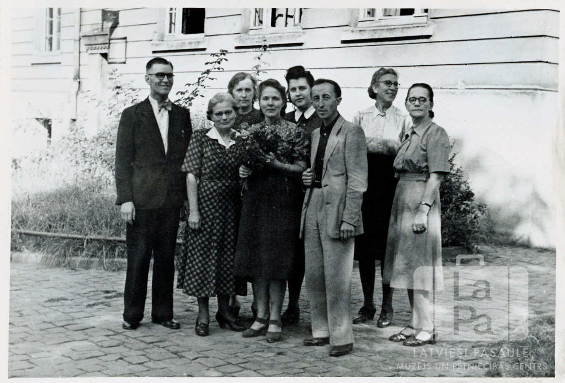 Latviešu pamatskolas skolotāji pie skolas ēkas Hānavas nometnē (angļu zonā) 1947.–1948. gadā. Skolotāji stāv divās rindās uz bruģētas takas; pirmās rindas vidū stāv sieviete ar ziediem rokās. Fonā ir gaiša mūra ēka.